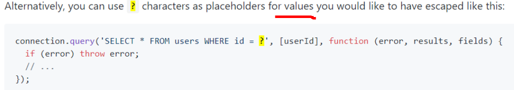 var exec = conn.query("select ?? from ?? where id = ? and password = ?",
