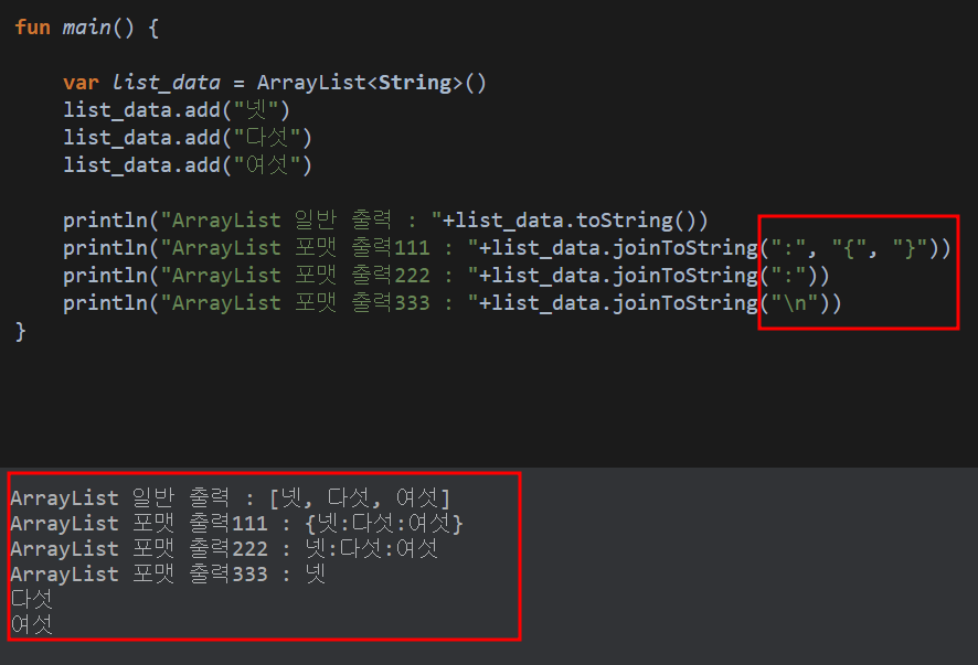 println("ArrayList 포맷 출력222 : "+list_data.joinToString(":"))